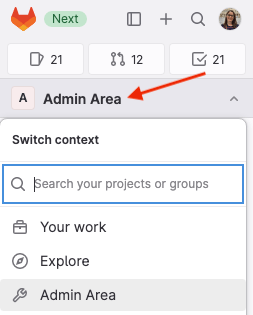 The next area of the left sidebar changes based on the information you're viewing. For example, you might be viewing a project, exploring projects or groups, or viewing your profile. Use this area to switch to other areas of the left sidebar.